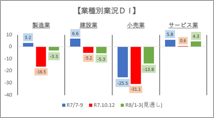 令和7年10~12月期の調査で、業況判断DIは、前期に比べ全業種悪化しました。
